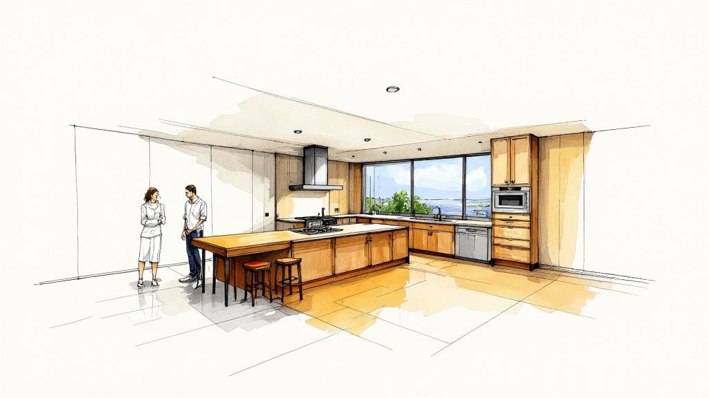 Et snedkerkøkken handler om balance. Før jeg saver i træet, bruger jeg tid på at føle rummet. Hvordan falder lyset ind? Hvor bevæger man sig naturligt? At tegne en kogeø er en øvelse i proportioner, hvor alt skal føles ubesværet.