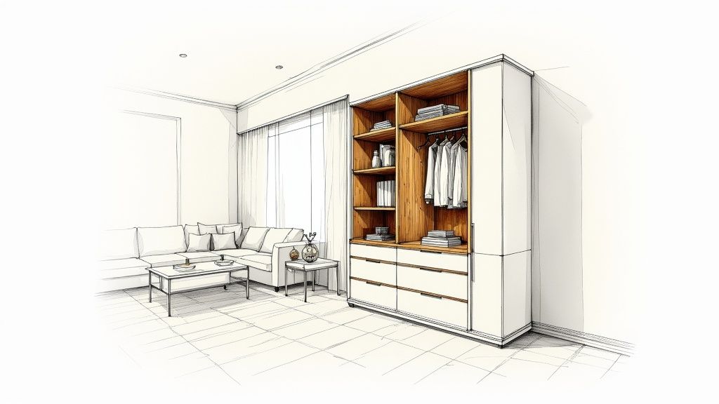 Jeg forestiller mig, vi sidder sammen. Du fortæller om dine drømme og de praktiske behov, dit nye skab skal dække. Her begynder rejsen. Med en samtale og de første streger på papiret. Det er her, vi sammen former grundlaget for et møbel, der passer præcist til dit liv.